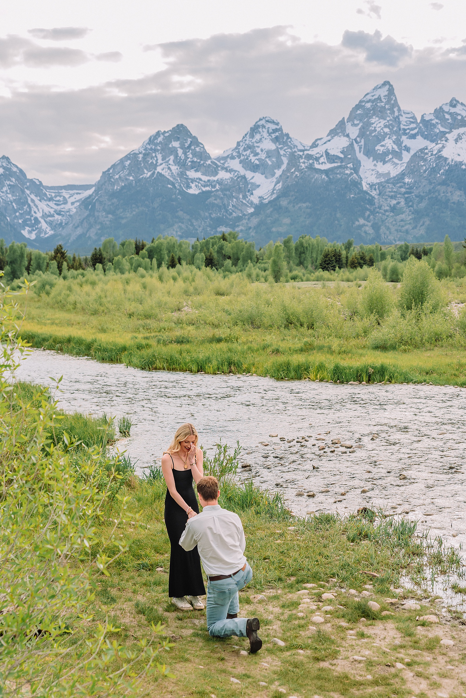 Proposal Photos Grand Tetons are truly magical, and Mason and Katherine’s early June engagement at Schwabacher Landing proved exactly why. The weather couldn’t have been more perfect for their special moment. Slight cloud cover softened the light while warm temperatures made the experience comfortable and romantic.