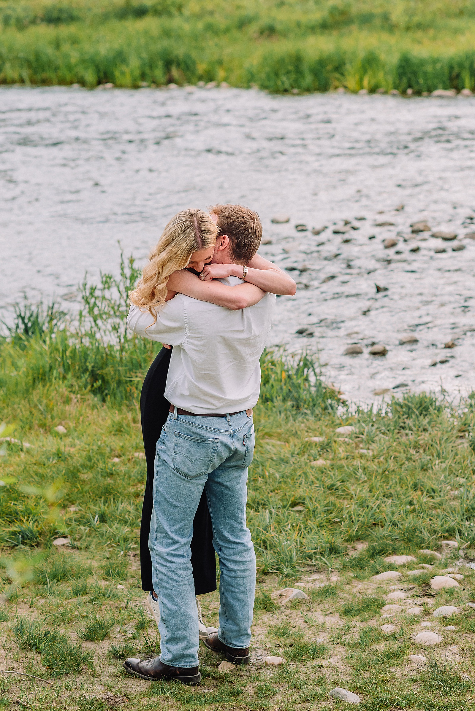Mason planned the ultimate surprise proposal along the river at the upper landing. Katherine looked stunning in her black dress paired with white sneakers—a perfect blend of elegance and practicality for the terrain. Mason complemented her style beautifully in a button-up shirt with jeans. Together, they looked amazing against the dramatic Teton backdrop.