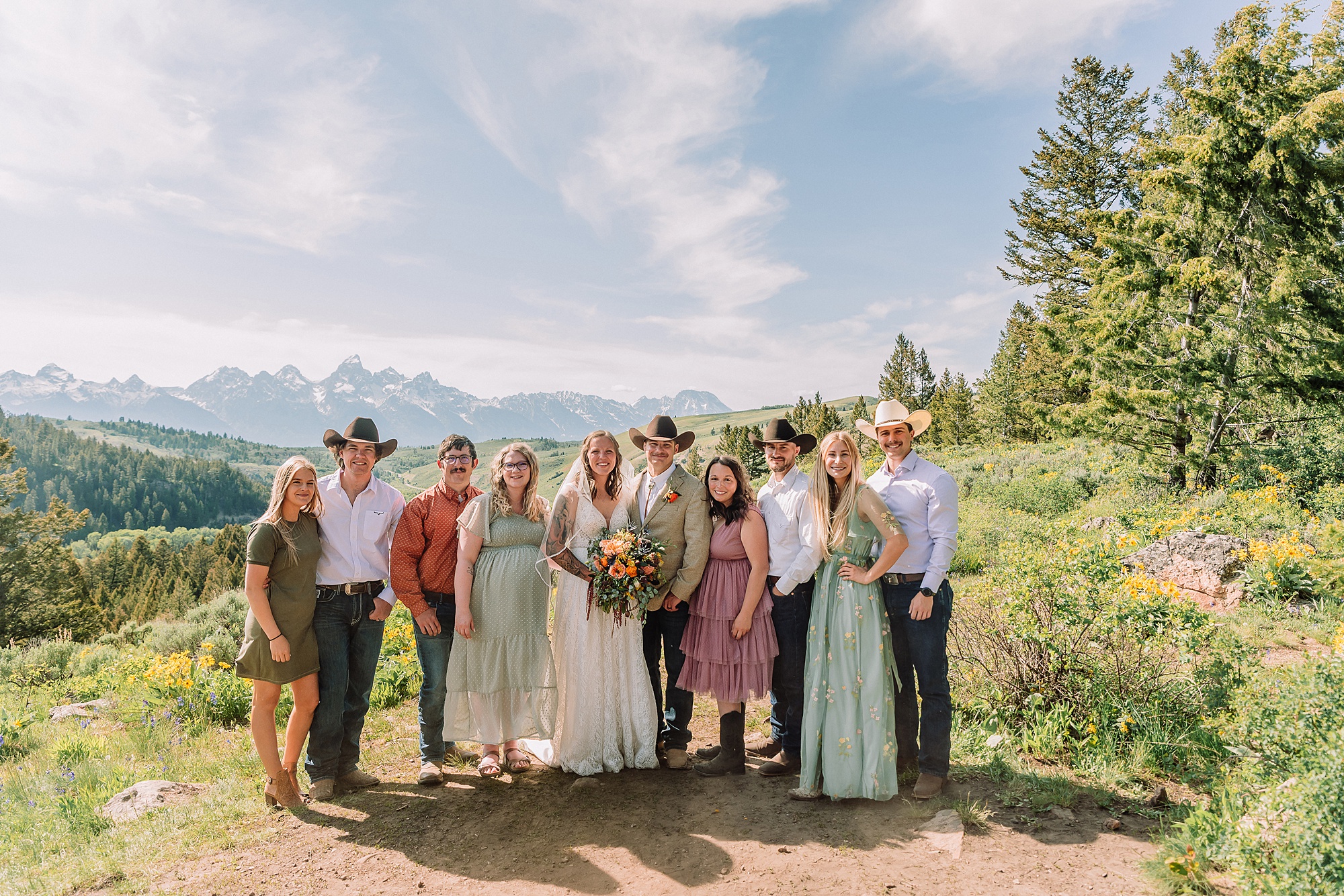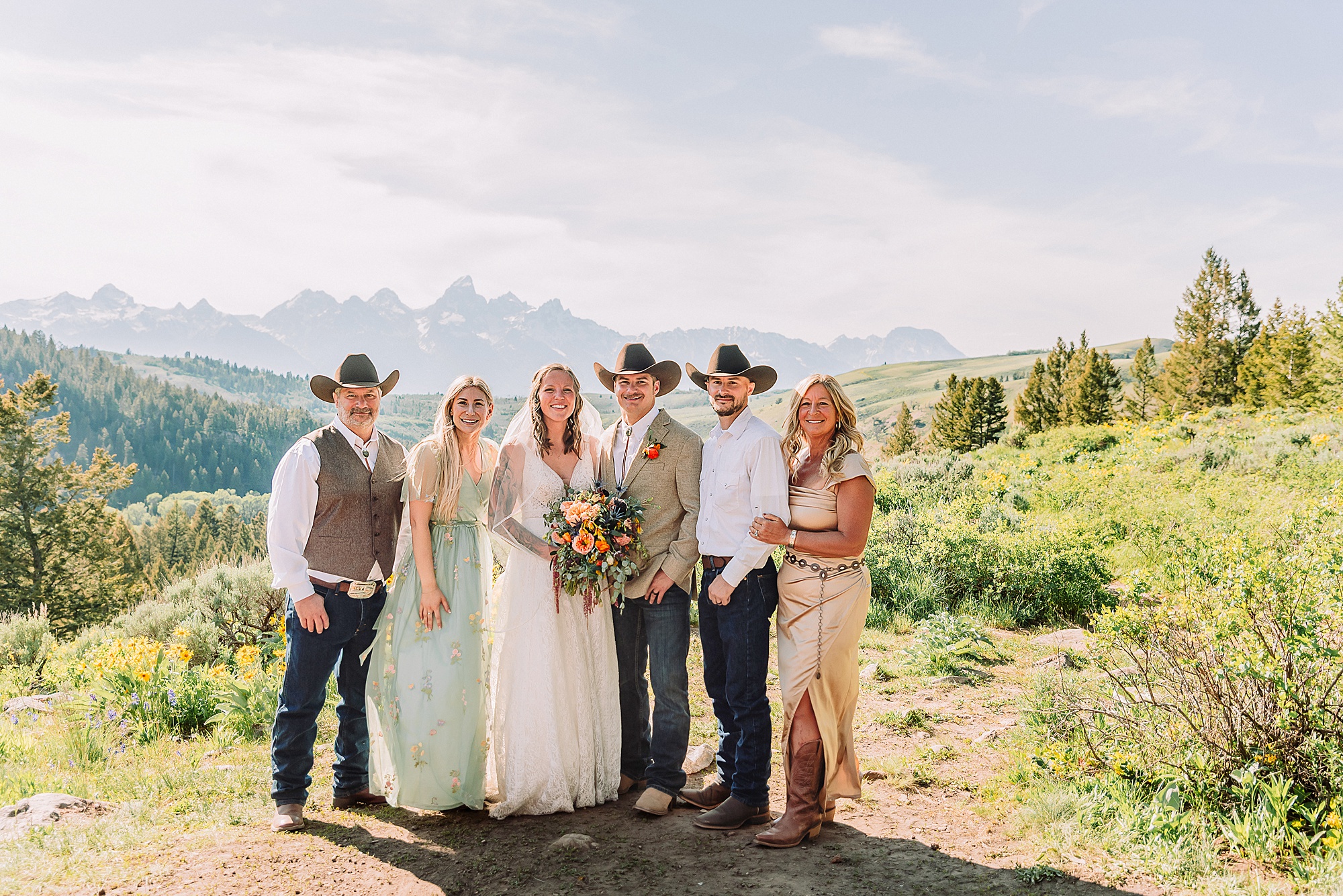 The couple exchanged vows at The Wedding Tree in Bridger-Teton National Forest, surrounded by family and the most magnificent natural cathedral imaginable. The timing couldn’t have been more perfect. Bright yellow wildflowers dotted the entire area, creating a stunning golden backdrop that complemented the towering peaks beyond.
