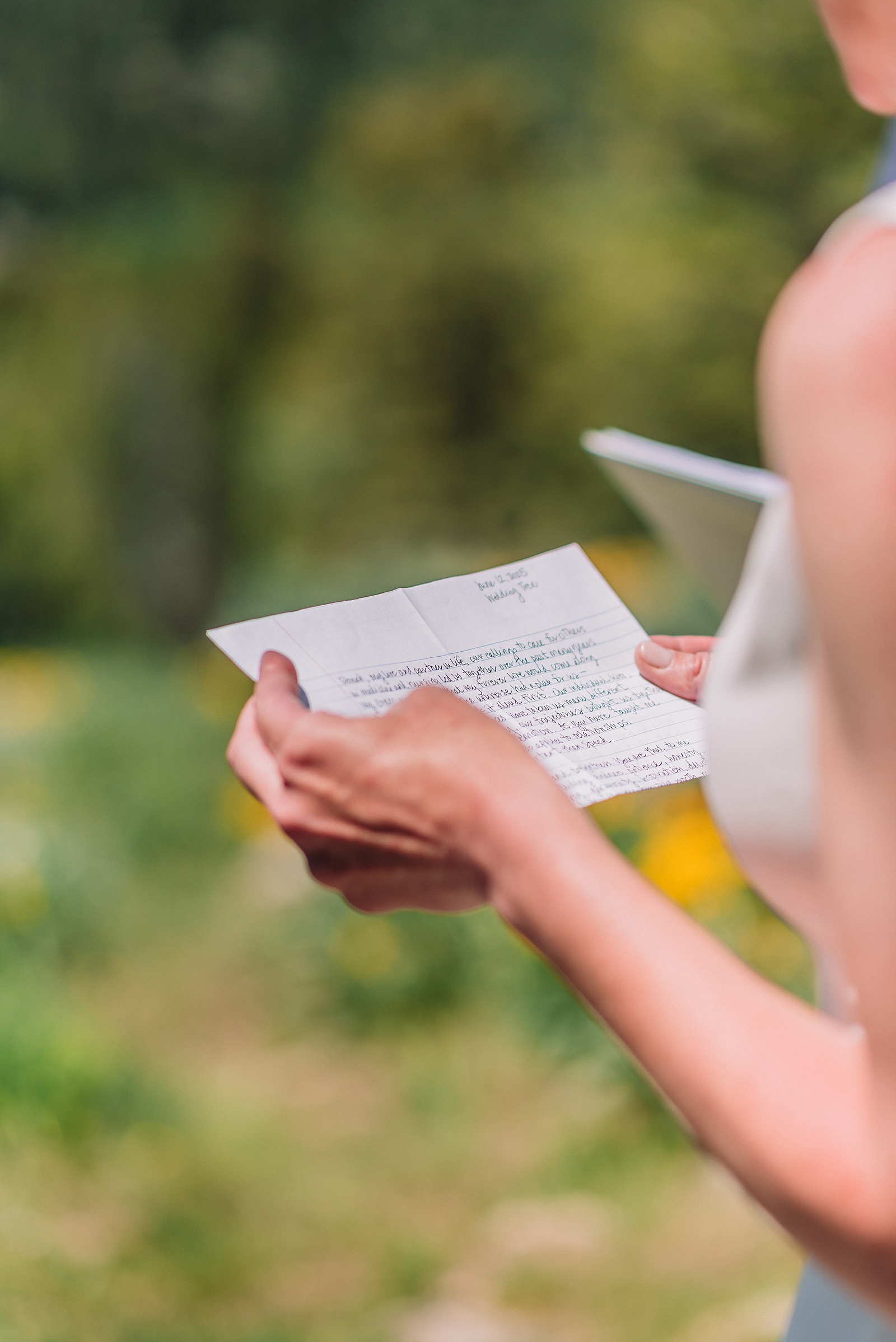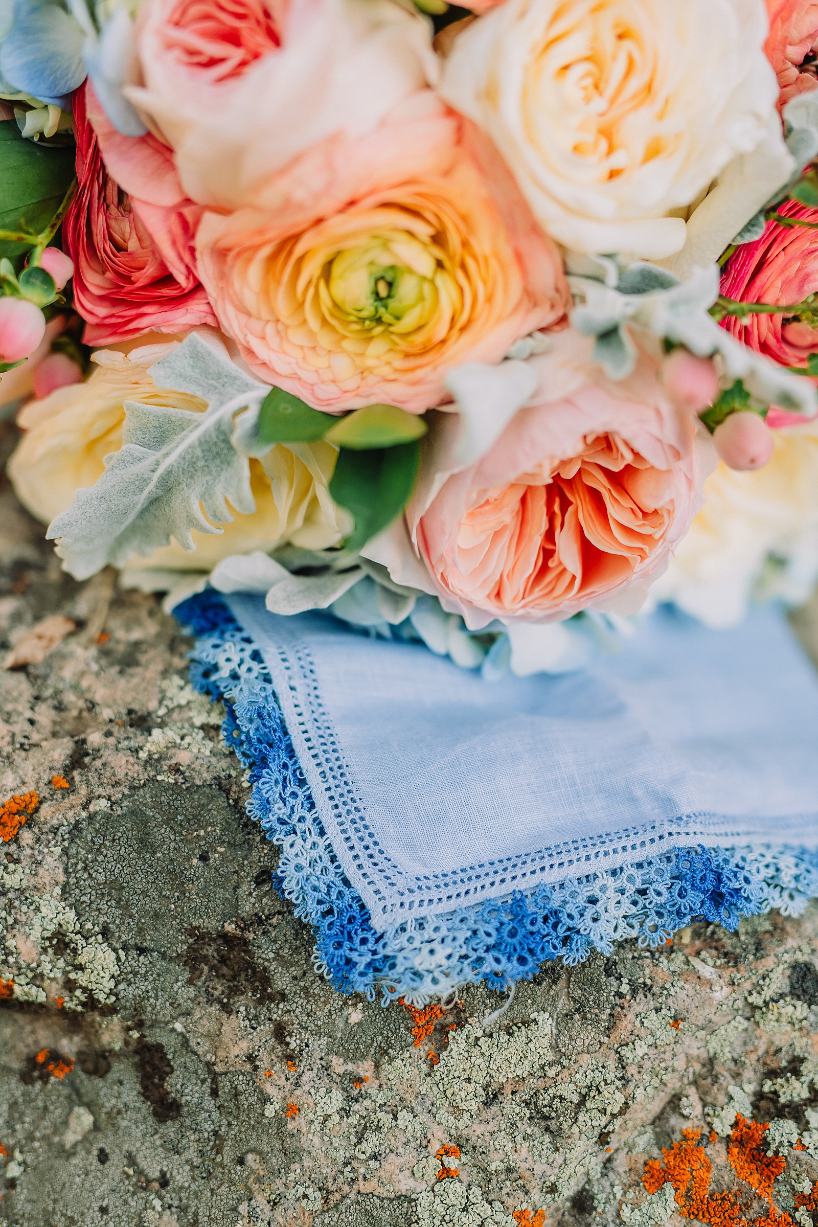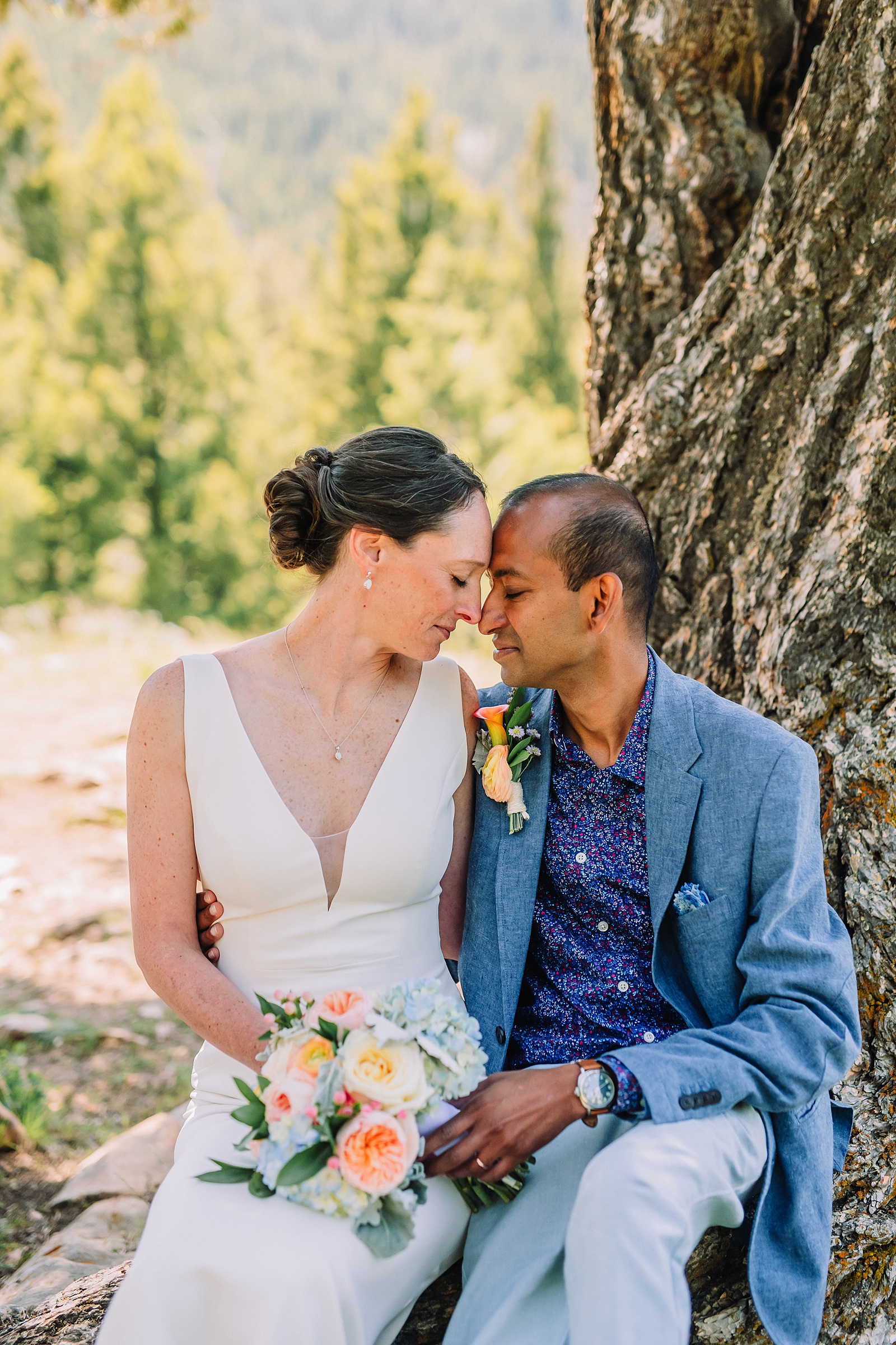 Julia carried a gorgeous bouquet featuring light pinks, creams, and blues that complemented the natural wildflower landscape perfectly. The couple took portraits throughout the area, walking among the wildflowers and sitting under the tree branches, soaking in the magic of their mountain wedding.