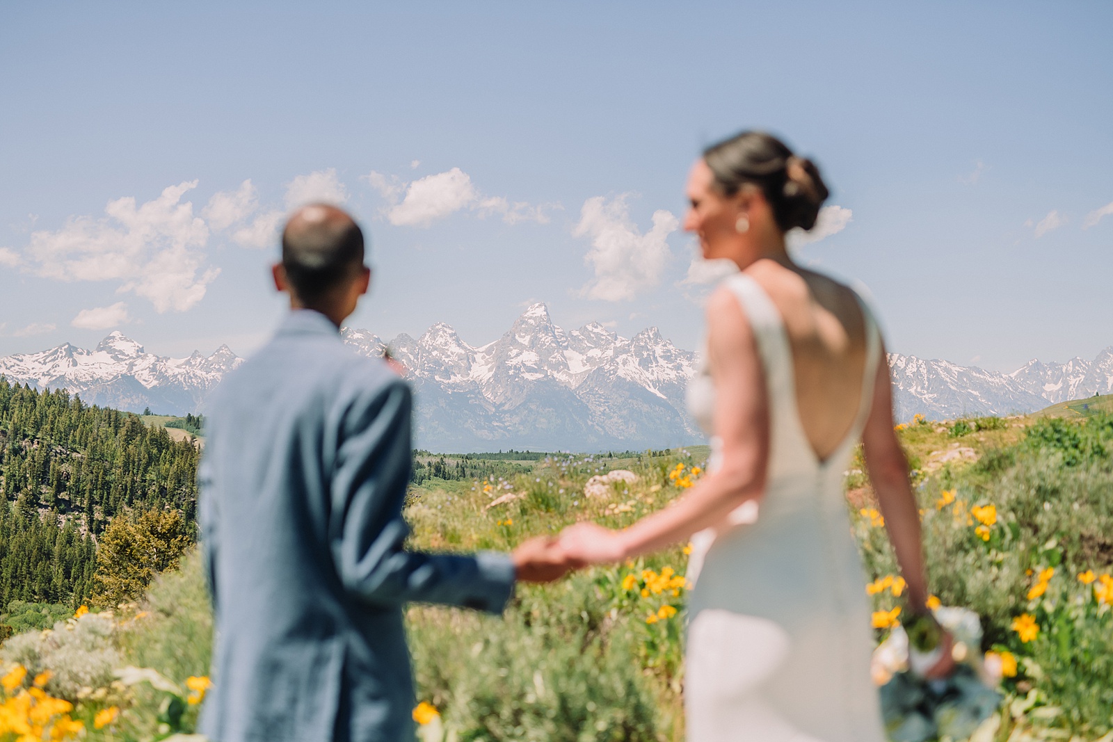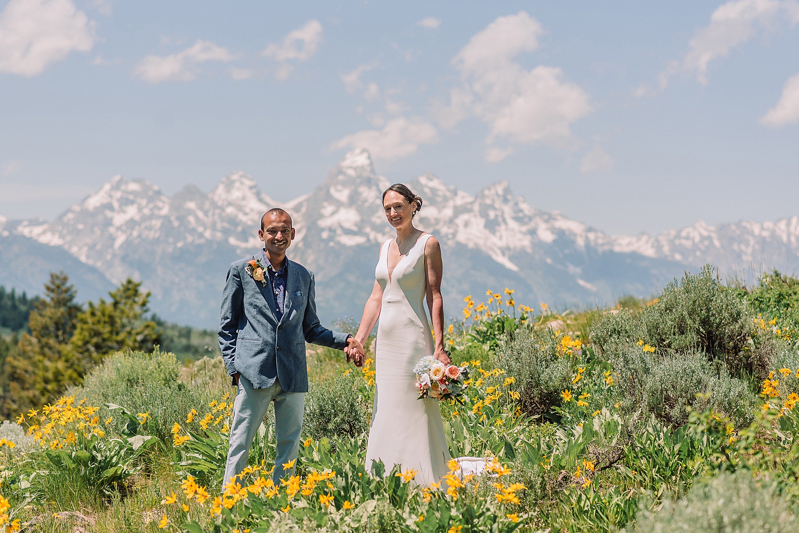 The timing couldn’t have been more perfect. The wildflowers were in full bloom, creating a vibrant carpet of color around the ceremony site. With wedding officiant Hamish Tear guiding the ceremony, Julia and Ronak exchanged personal vows that were incredibly touching and authentic. They exchanged wedding rings and sealed their commitment with a kiss with the majestic Tetons towering in the background, their peaks still dusted with snow.