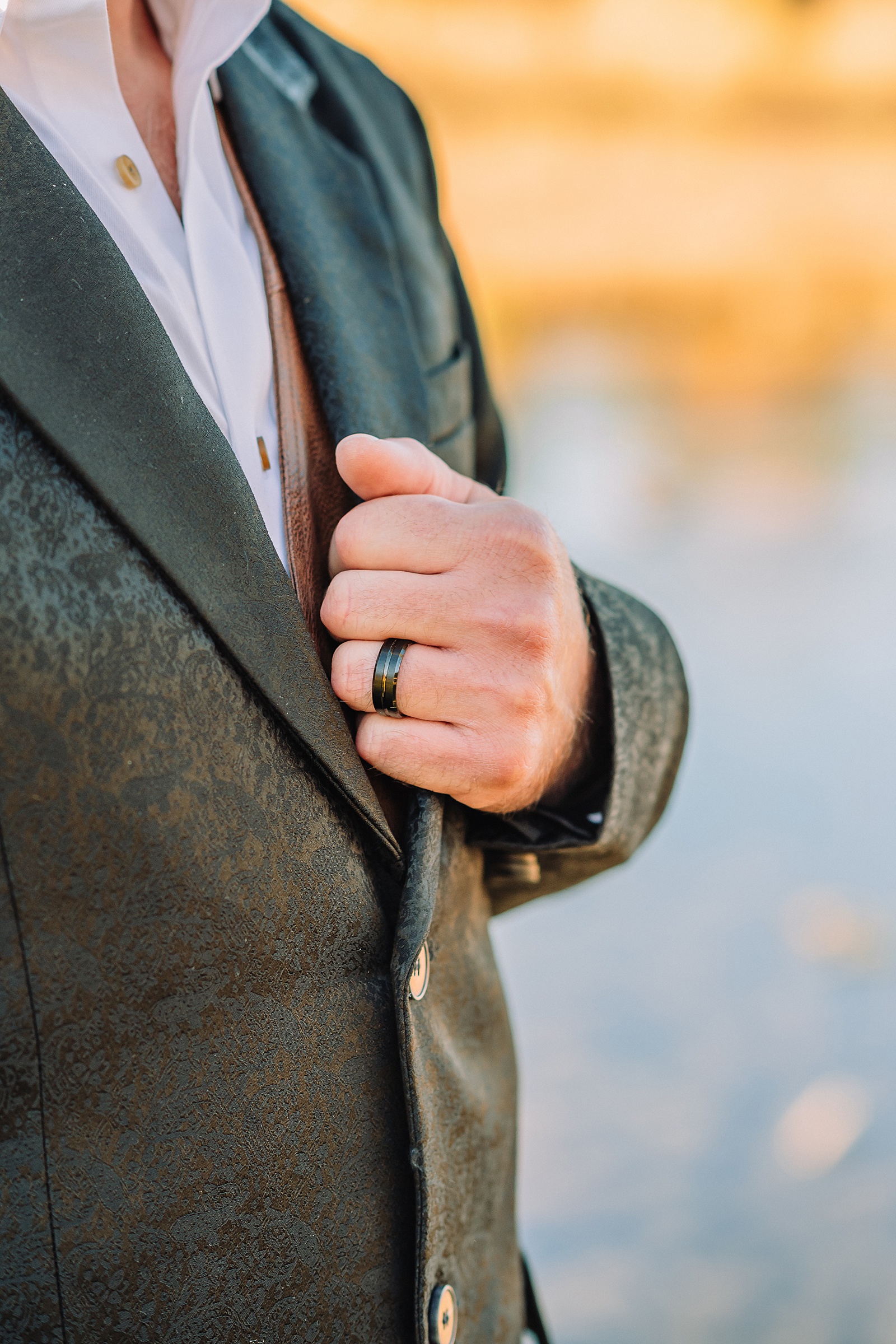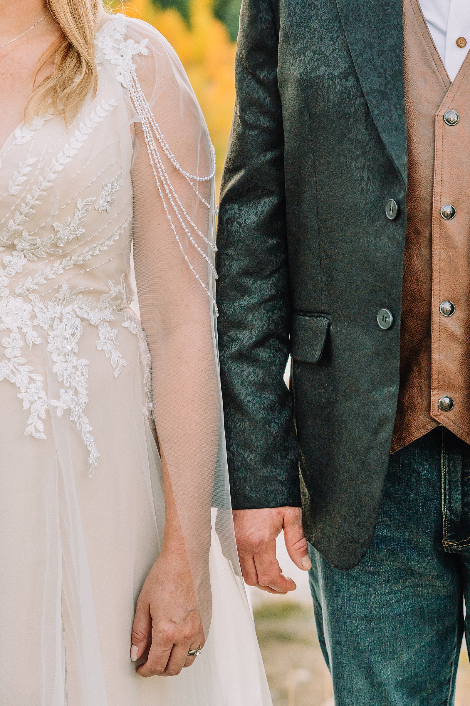 We started down by the Snake River’s edge, using the warm golden light to create romantic, glowing portraits. Tracy’s dress was a confection of beads and sheer fabric with a whimsical cape that connected the sleeves, perfect for movement shots. Randy complemented her look with jeans, a white button-up, brown leather vest, and a black printed blazer for a timeless western aesthetic.