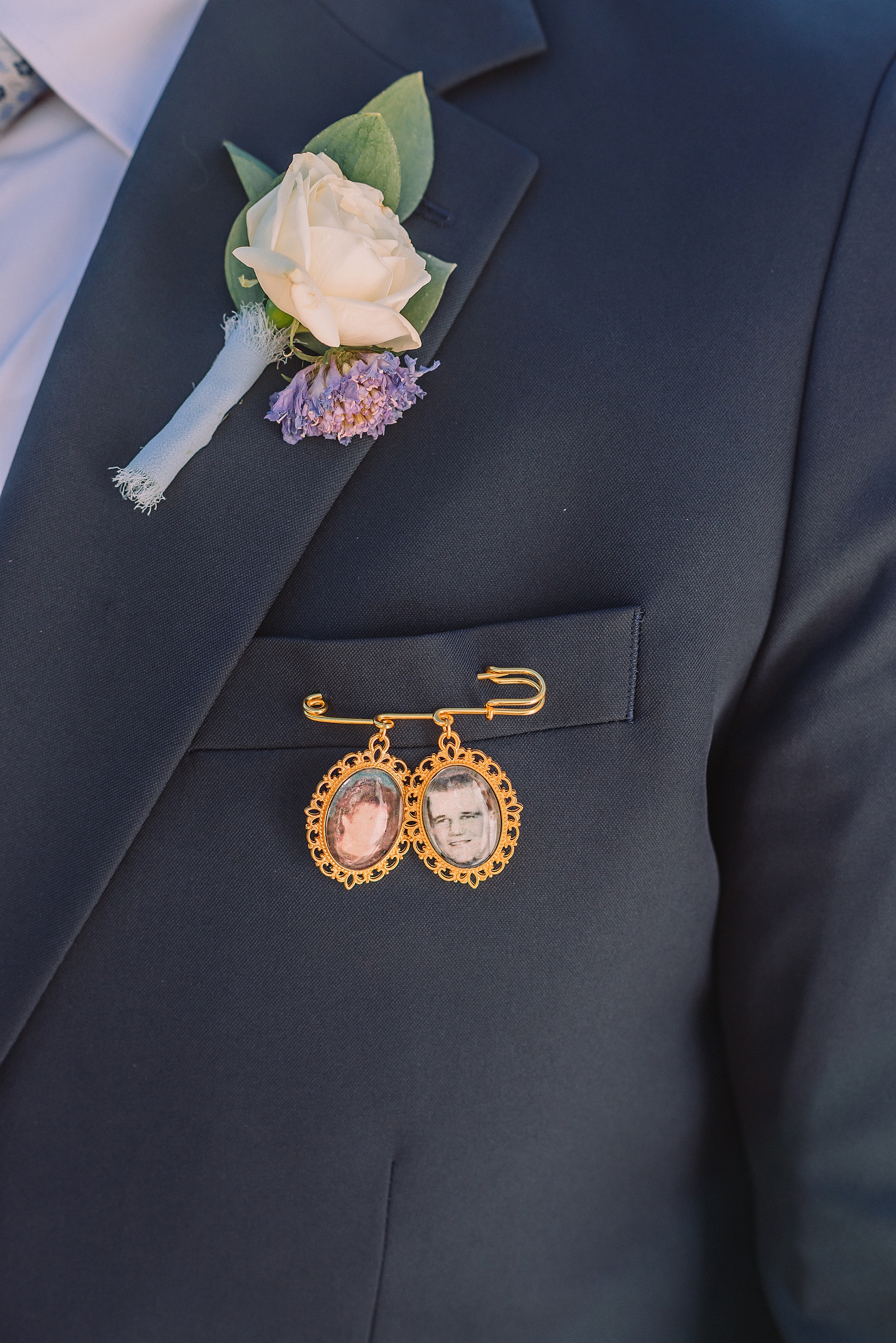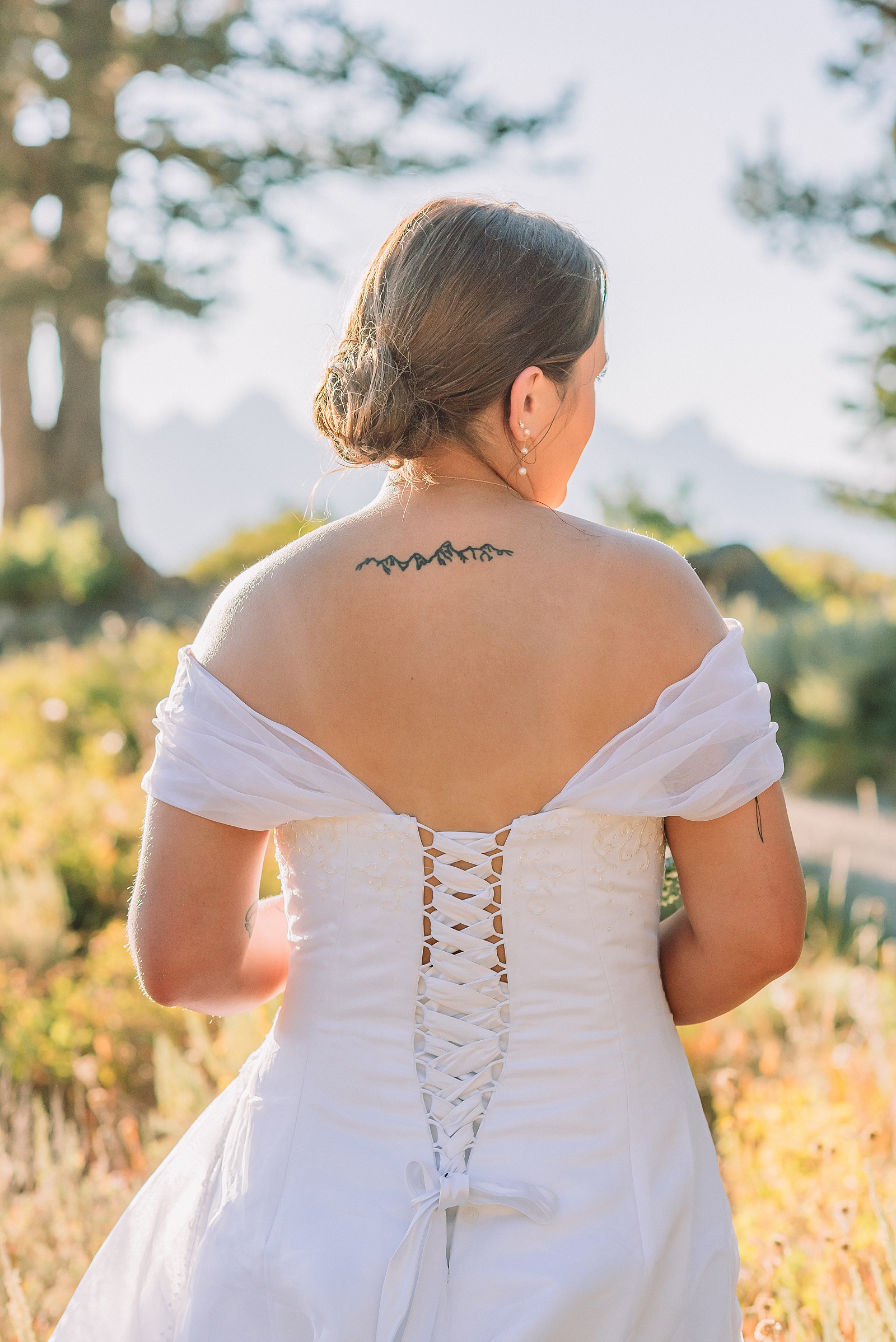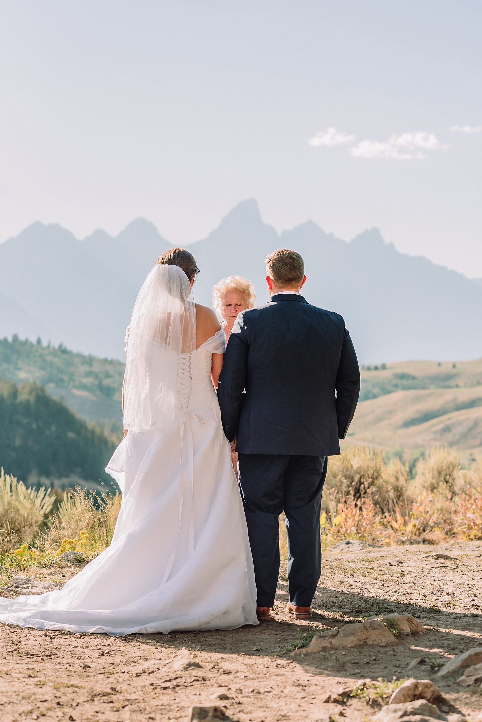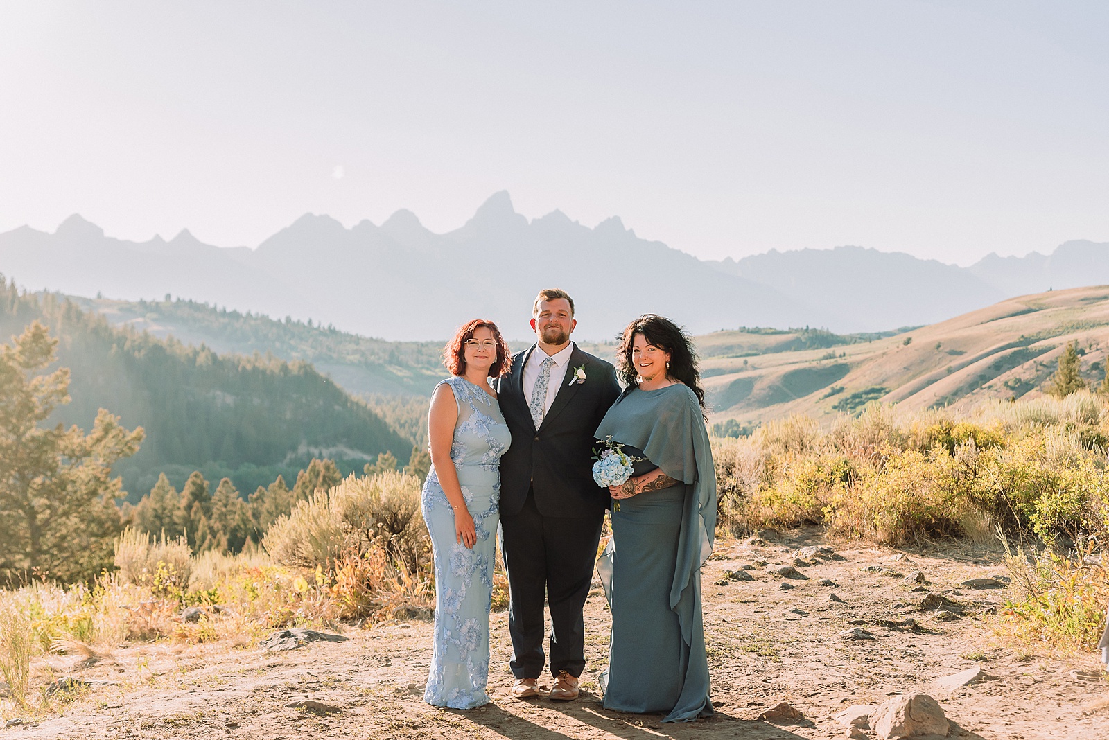 The couple honored loved ones who have passed with small framed photos—Katie attached hers to her bouquet while Elliot kept his pinned inside his suit coat. For portraits, we moved them to the outside of his jacket to capture this meaningful tribute. Katie’s Teton tattoo made for an incredibly unique shot with the actual mountain range creating a stunning backdrop.