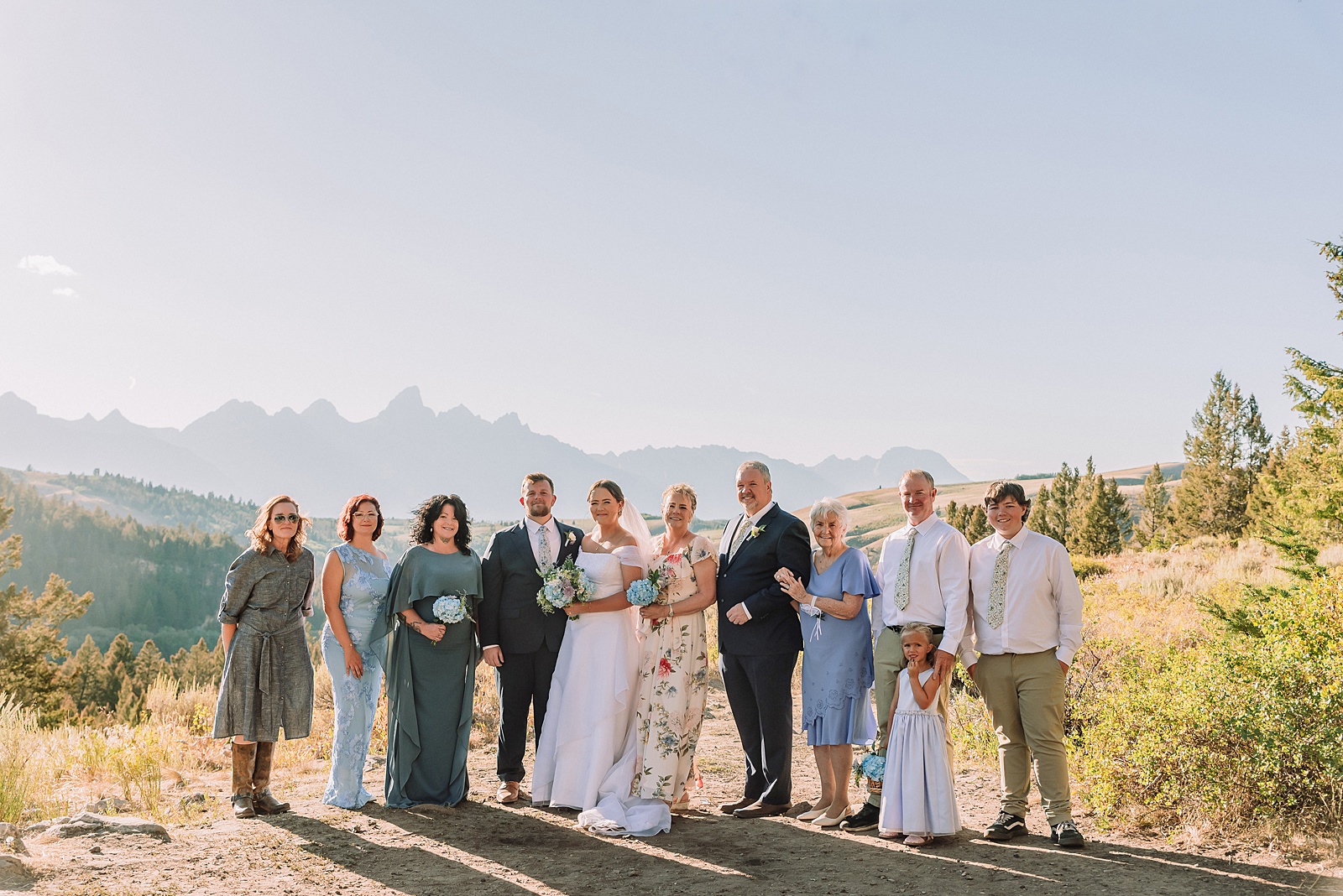 After their ceremony, the entire wedding party headed to Schwabacher Landing for portraits. The light was fading quickly, so we worked efficiently to capture important family photos before focusing on couple portraits. The evening blessed us with calm conditions and less intense wind than at The Wedding Tree, creating the perfect atmosphere for romantic photos.