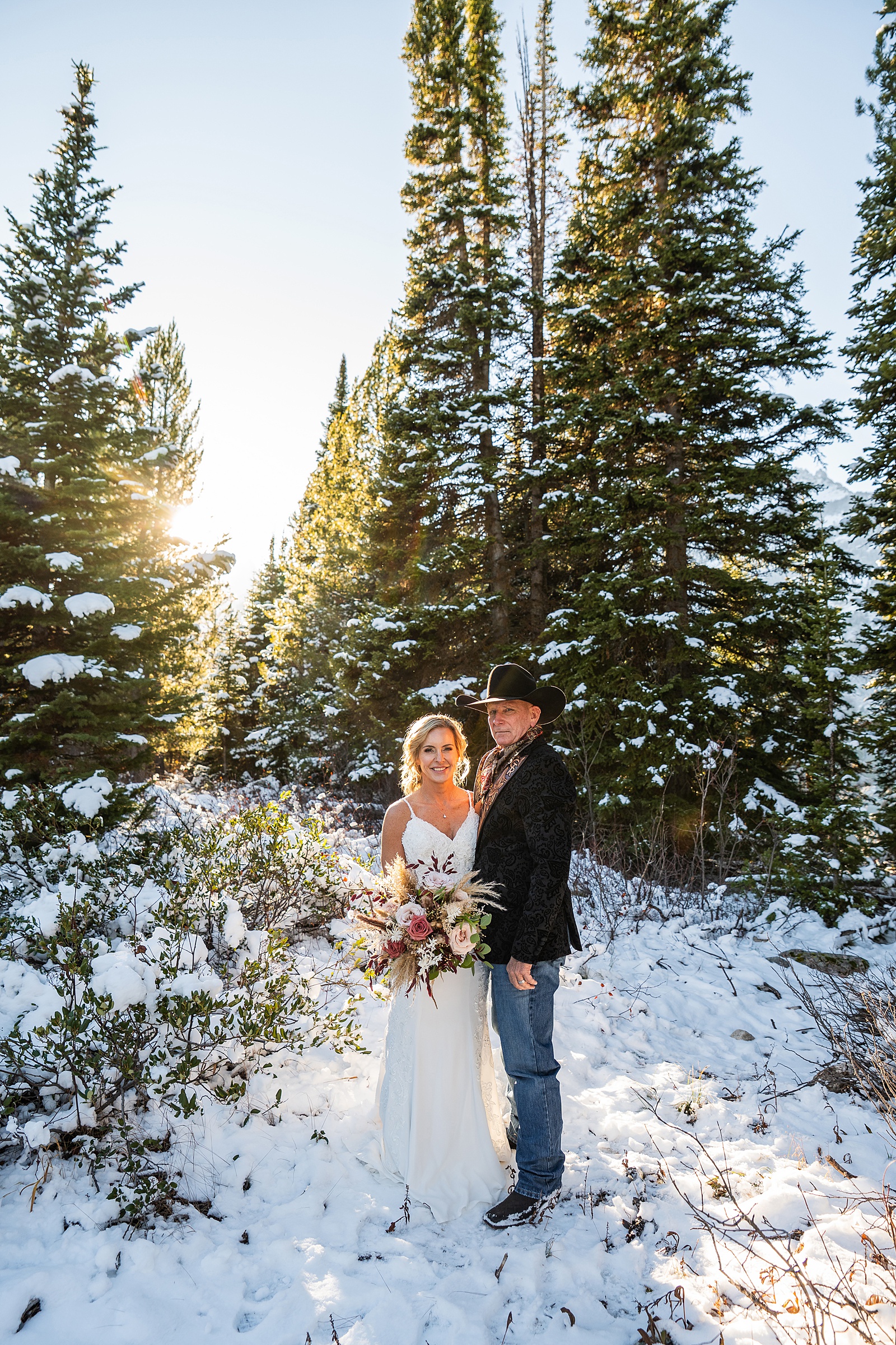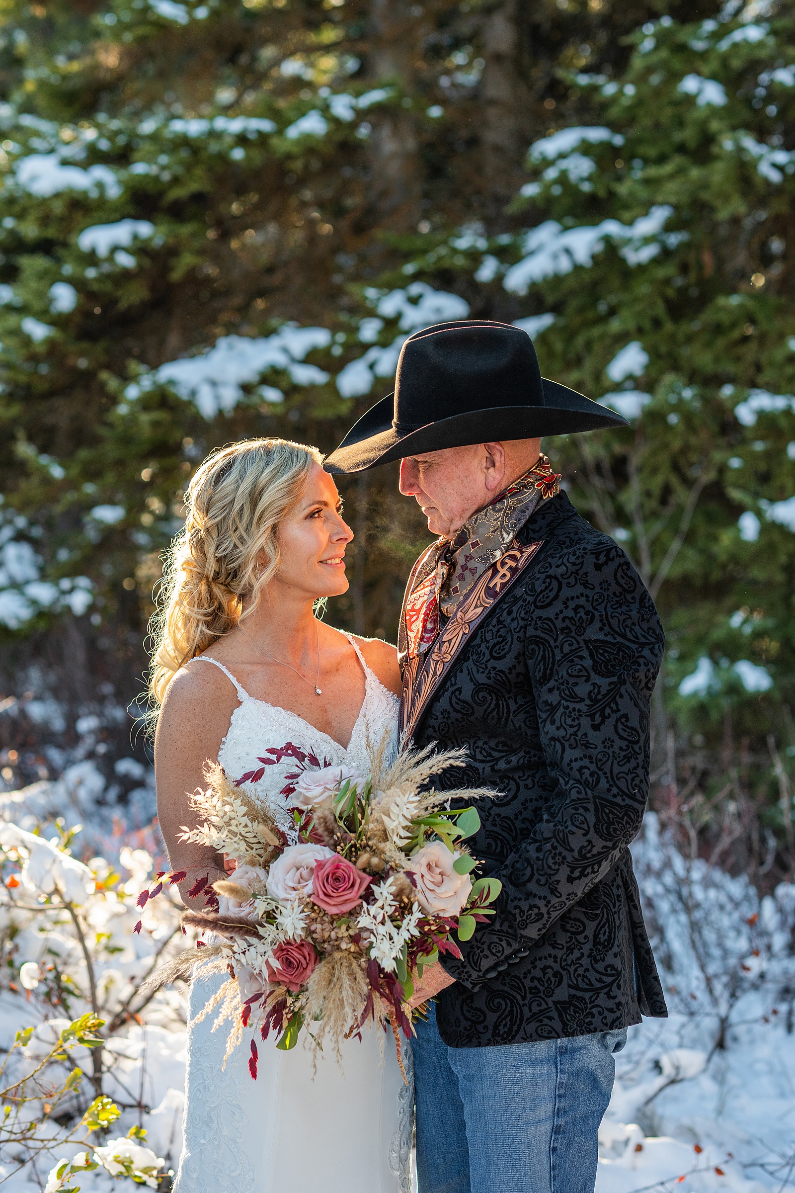 Our mountain wedding photography adventure began at Jenny Lake, a location Clint and Tracey chose after reviewing my location guide. Pockets of snow lingered in shaded areas and dusted the bridge, creating the magical seasonal variety they craved. Clint’s style was unforgettable. He rocked an elevated cowboy aesthetic with jeans, a black paisley-embossed suit jacket featuring leather lapels with floral details and his monogram, topped with a vest, scarf, and black hat. Tracey stunned in a satin gown adorned with lacy, beaded embellishments and illusion backing that caught the light beautifully.
