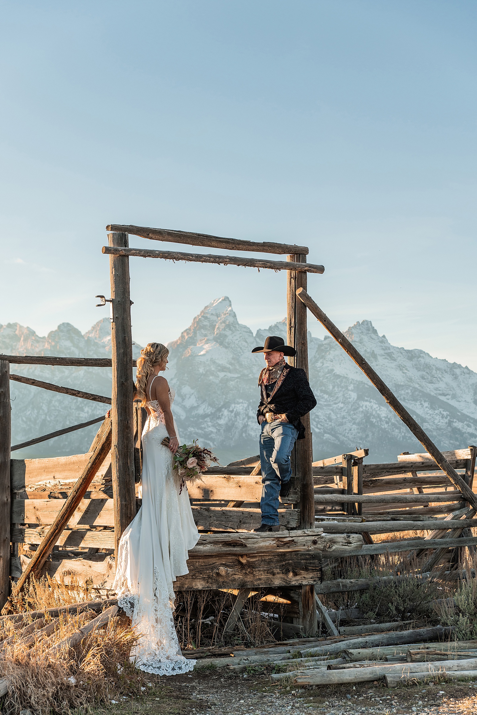 Mormon Row provided our second location, and did not disappoint. The Antelope Flats offer golden grasses, weathered barns, rustic corrals, and sagebrush framed by snow-capped peaks. It was easy to see why this was their first choice. The couple prioritized romantic portraits among the grasses and along the corral fencing with those iconic Teton views, though we captured a few barn shots too.